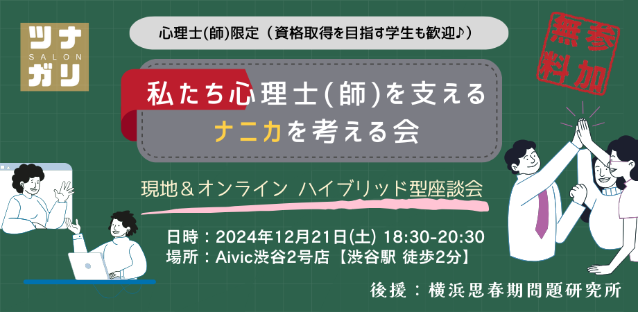 - イベントテーマ:私たちの仕事って決して楽な仕事ではないと思います。報われることばかりでない、むしろ報われないことの方が多いかもしれません。何がこの仕事を続けていられる支えになっているのか?支えではなく使命感みたいなもので成り立っているのか?私たち心理士(師)が仕事を続けていける支えになっているナニカについて一緒に語り合ってみませんか?